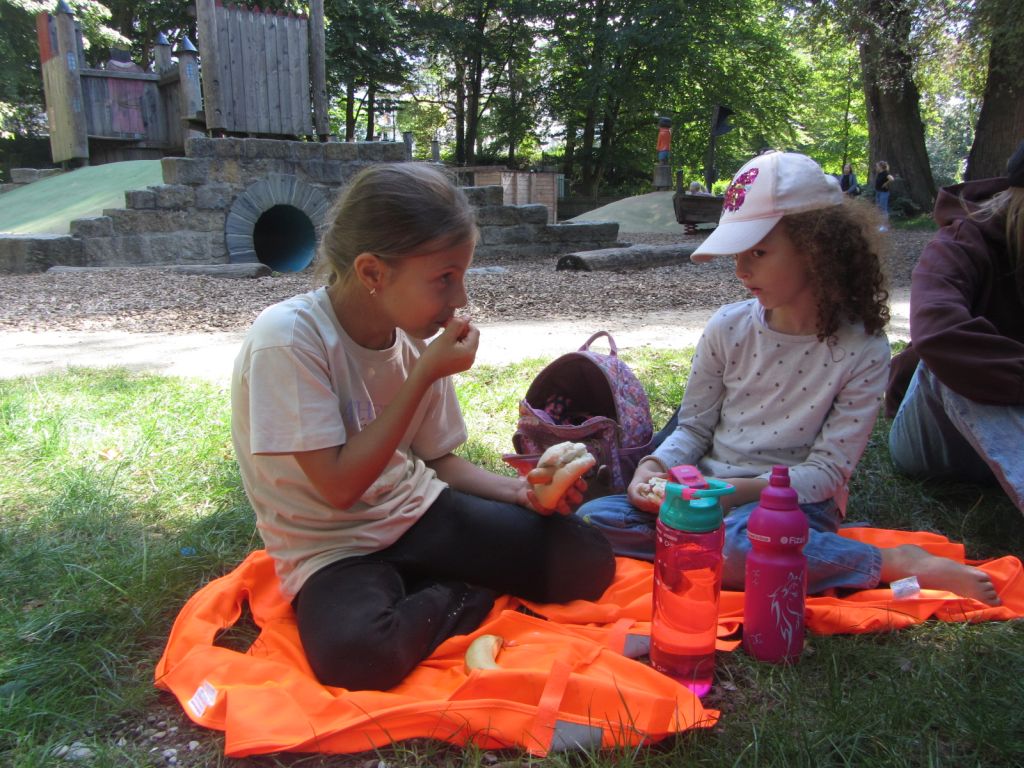 Dort angekommen, spazierten wir durch den Roten Tor Park bis zum Spielplatz. Und dann hieß es: Freie Zeit zum Spielen, Klettern, Lachen und natürlich Brotzeit machen! Die große Wiese und die Spielgeräte boten jede Menge Platz zum Austoben. Während die meisten von uns noch fröhlich spielten, machte sich eine kleine Gruppe auf den Weg, um das Mittagessen für alle zu besorgen.