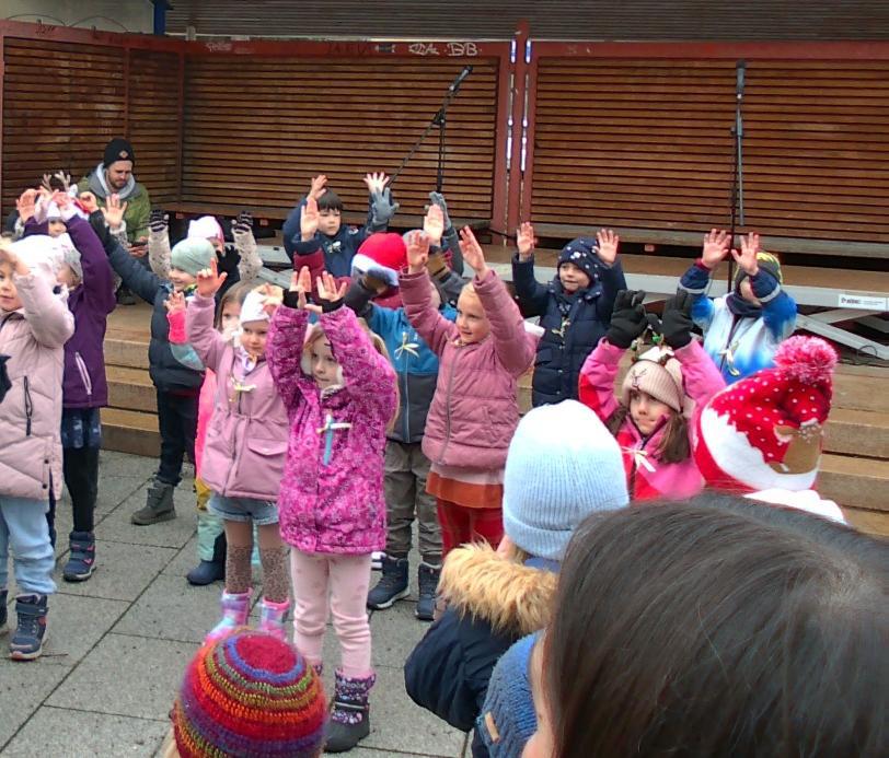 Für Unterhaltung an der Dorfweihnacht sorgten an beiden Tagen zudem verschiedene Auftritte, an denen wir als Kita uns ebenfalls beteiligten. Ob Flötengruppe, Alphornbläser oder der Musikverein – die musikalische Untermalung sorgte stets für weihnachtliche Stimmung. Ein Highlight der Dorfweihnacht war am Sonntagnachmittag natürlich der Tanz und Gesang unserer Kindergartenkinder zu „Merry Christmas everyone!“.