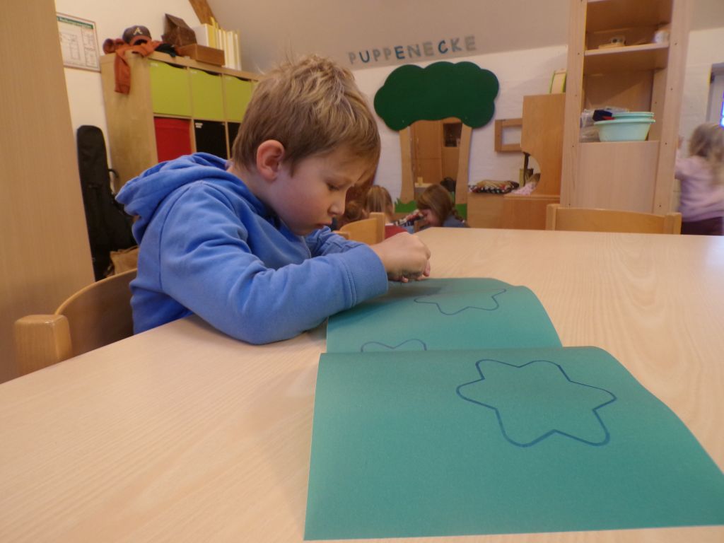 Die Sonnenkinder zeigten beim Prickeln ihrer Laternen große Geduld und Konzentration. Zuerst wurden Sterne aufgezeichnet, dann mit kleinen, präzisen Löchern entlang der Linien ausgeprickelt. Nachdem die Sterne herausgelöst waren, legten die Kinder farbiges Transparentpapier dahinter. So entstanden wunderschöne, leuchtende Sterne, die beim Laternenumzug funkeln wie der Nachthimmel.