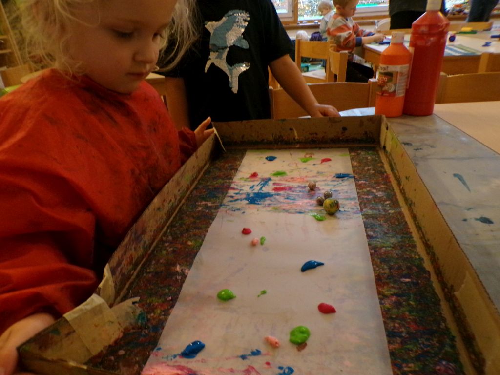Unsere jüngsten Delfine, die Sternschnuppen, durften ihre Laternen mit der Murmeltechnik gestalten. Dafür wurden bunte Farbkleckse auf das Laternenpapier getropft und Murmeln darauf hin- und her gerollt. Durch die Bewegung der Murmeln entstanden einzigartige Muster jede Laterne ein echtes Unikat. Im Laternenlicht wirken die Farben besonders leuchtend und machen die kleinen Künstlerinnen und Künstler sichtlich stolz.