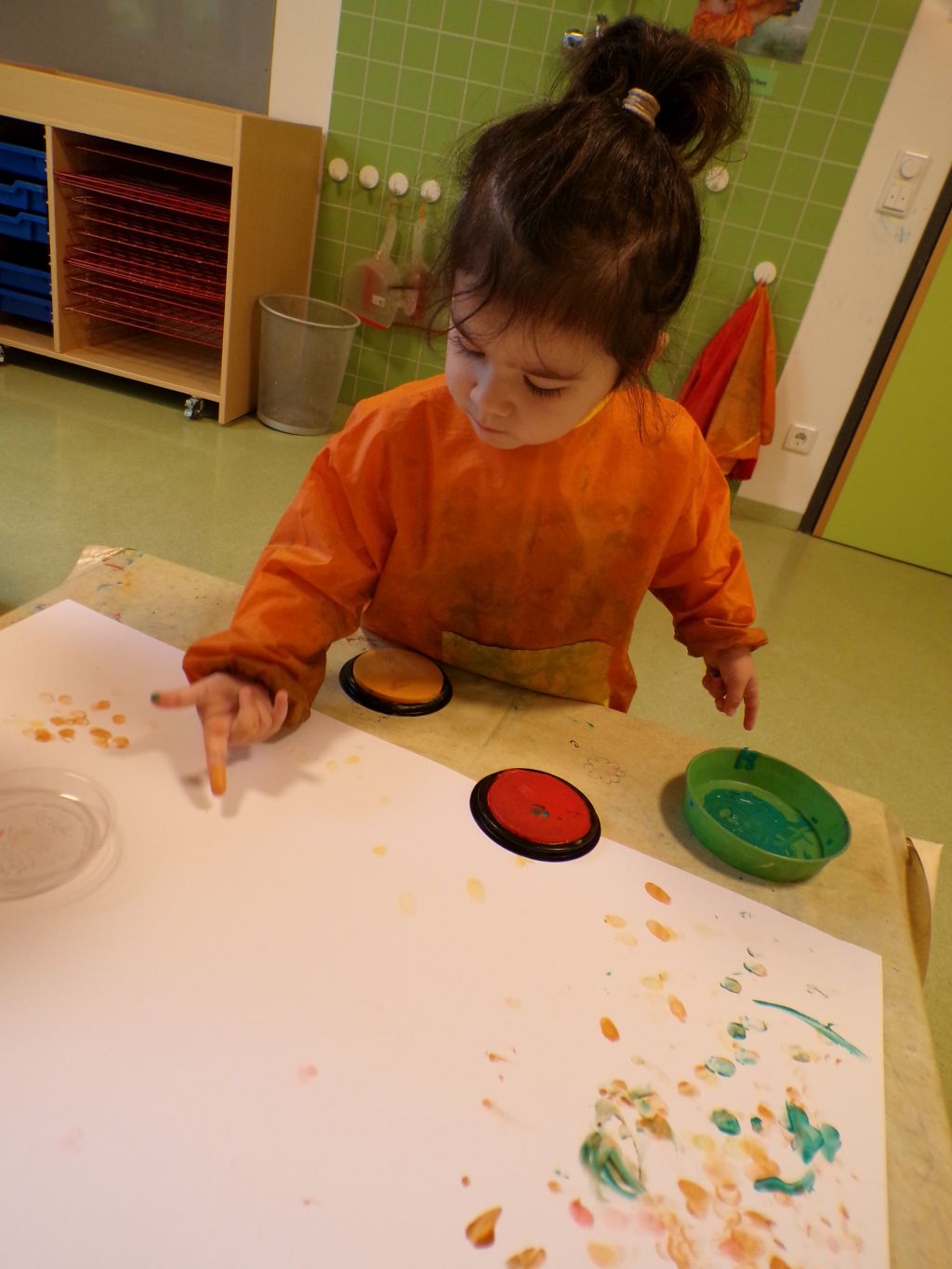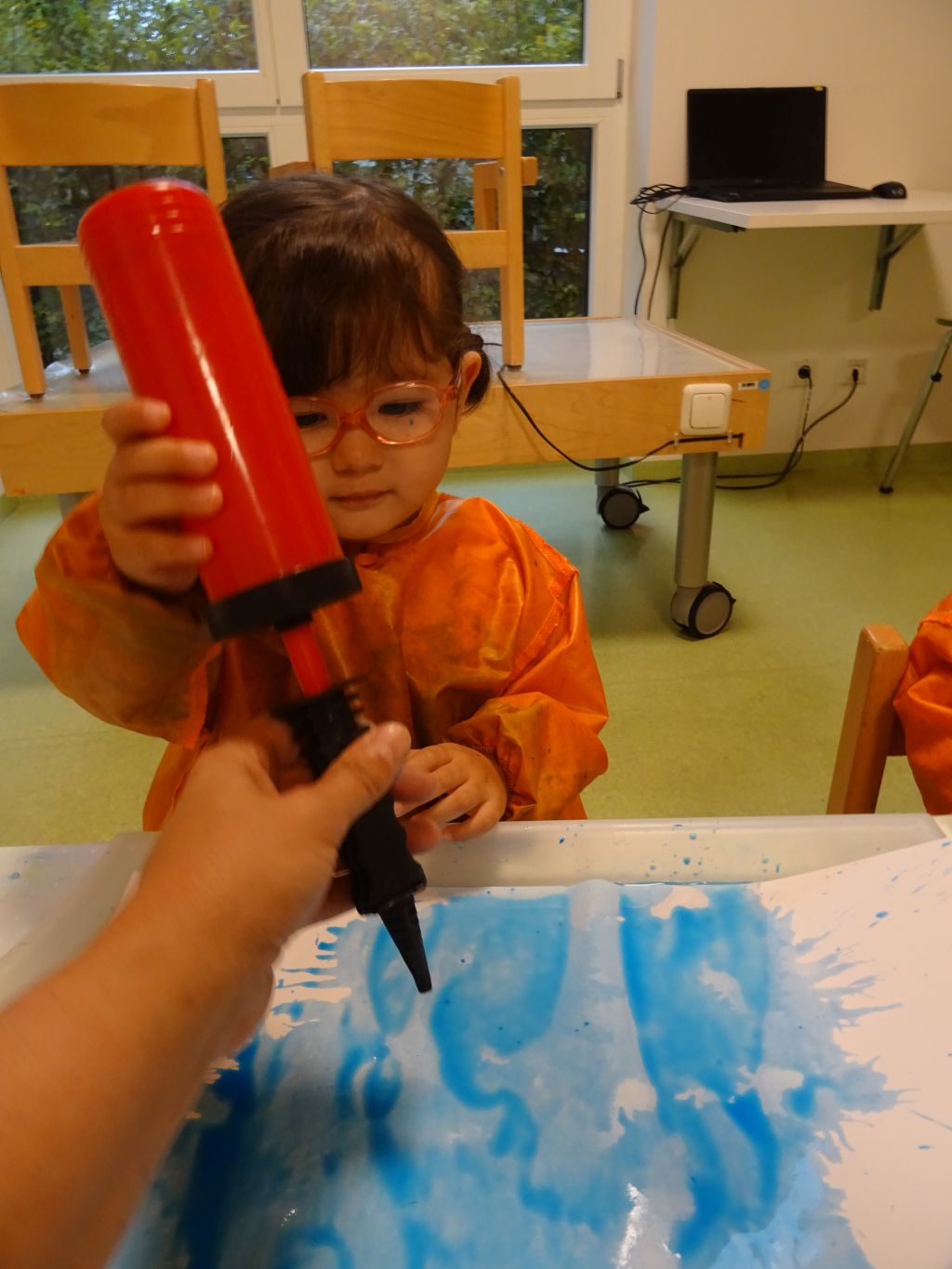 Bei der Gestaltung unserer Kunstwerke kamen viele unterschiedliche Techniken zum Einsatz. Während das eine Kind mit dem Finger oder der ganzen Hand malt und spuren zieht, bevorzugt das andere Kind einen Stempel. Die Einen können an geraden Linien entlang schneiden, während andere Freude daran haben, sich im Zickzack durch das Bastelpapier zu arbeiten. Bei den Pfützenbildern bekamen die Kinder die Möglichkeit, mit der Luftballonpumpe auf die Farbe zu blasen um Spritzer zu erzeugen. Die Kleinsten patschten intuitiv mit der flachen Hand und erzeugten genauso tolle Spritzer. Wie auch immer der Weg ist, die Kunstwerke sind einzigartig und individuell.