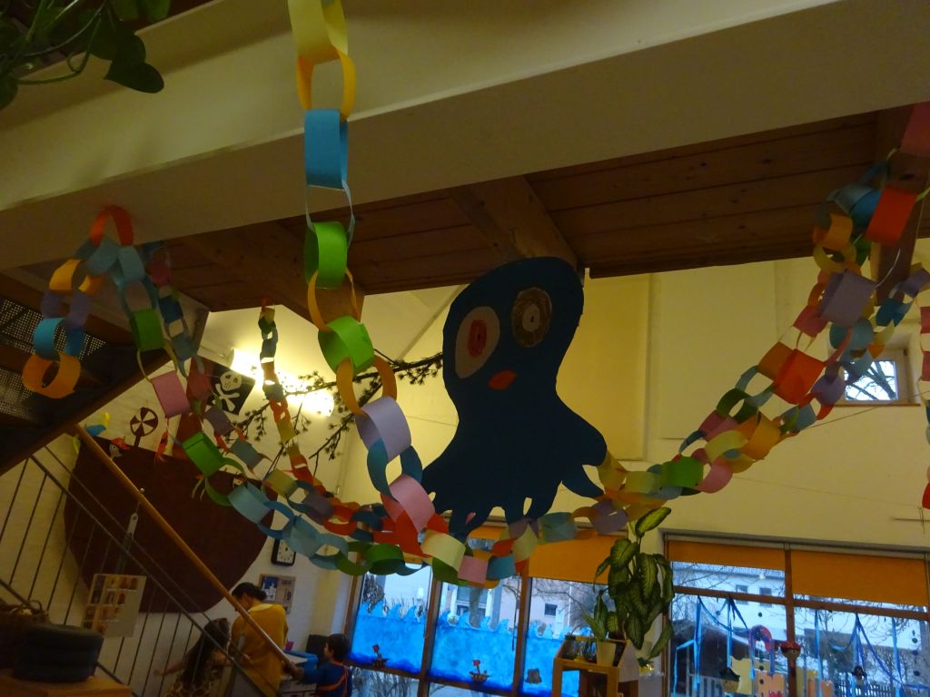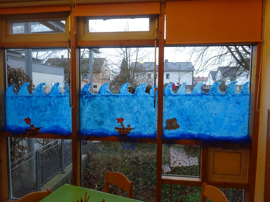 Im Februar ging es um Fasching, dass Thema für unsere Feier hatten wir über eine demokratische Wahl ausgewählt. Jedes Kind hatte zwei Stimmen und durfte diese anonym zum gewünschten Thema abgeben. So lernen die Kinder schon früh wie unser politisches System funktioniert. Am Ende hatte sich die Mehrzahl der Kinder für das Thema Piraten und Meerjungfrauen entschieden. Passend zum Thema veränderten wir den Gruppenraum mit einem großen Piratenschiff, die Fensterfront wurde zum wilden Meer, eine große Krake schwamm an unserer Zimmerdecke – das sorgte für das passende Ambiente und machte Spaß beim Gestalten. Die Kinder experimentierten wie sich Styroporschiffe auf dem Wasser verhalten und diese mit zwei Magneten auf dem Wasser bewegt werden können.