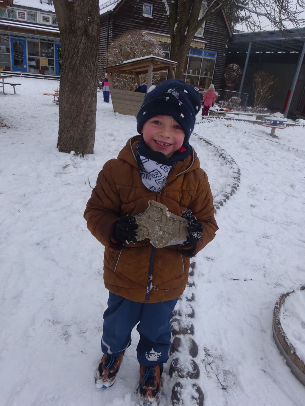 Im Garten nutzten wir die Tage an denen es schneite selbstverständlich für eine Schneeballschlacht. Die Kinder kamen dabei in Bewegung, übten zielen und werfen und trainierten dabei noch mit Freude ihre Ausdauer. Die Kinder rollten kleine Bälle zu dicken Kugeln und wir bauten Schneemänner- und frauen, dass sah lustig aus und forderte den ganzen Körper sowie Teamarbeit. Die Kinder warfen sich gerne in den Schnee.