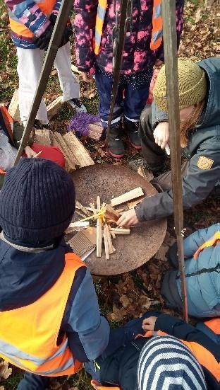 Am diesjährigen Buß- und Bettag machten sich die Eulen und Füchse auf zu einem besonderen Abenteuer: Outdoorkochen im Siebentischwald. Mit Bus und Bahn nahmen wir gemeinsam den etwas weiteren Weg auf uns. Die Vorfreude war groß, und als wir schließlich im Wald ankamen, ging es sofort los. Zuerst bereiteten wir das Lagerfeuer vor, auf dem später unser großer Kochkessel stehen sollte. Mit vereinten Kräften wurde das Brennholz gesammelt und sorgfältig aufgeschichtet. Dann begann das große Kochen. Viele fleißige Helferkinder schälten und schnitten Karotten, Paprika, Zwiebeln und Kartoffeln, Stück für Stück wanderte das Gemüse in den großen Topf, wo es langsam vor sich hin köchelte und einen wunderbaren Duft im Wald verbreitete.