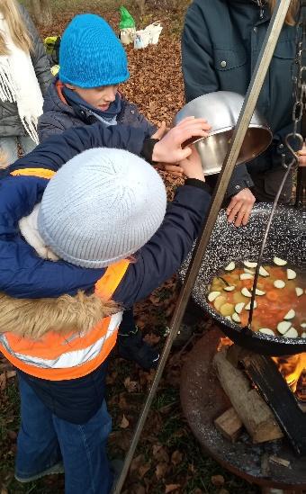 Während der Eintopf garte, hatten die Kinder Zeit, den nahegelegenen Spielplatz zu erkunden. Später warteten spannende Erlebnisstationen auf sie: Aus Naturmaterialien konnten Namensschilder gebastelt werden, mit Salzteig entstanden lustige Formen, die an die Bäume geheftet wurden, und ein Fühlmemory sorgte für Grübeln, Lachen und viele kleine Aha-Momente. Gegen Mittag kamen noch frische Kräuter in den mittlerweile gut durchgezogenen Eintopf. Dann war es so weit: Der warme, gesunde und kräftige Gemüseeintopf war fertig, genau das Richtige bei dem kühlen Wetter. Gemeinsam versammelt rund um den Topf schmeckte er allen besonders gut.