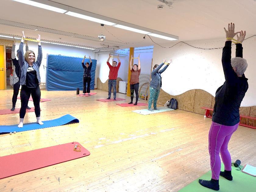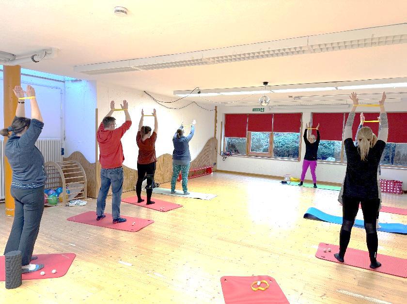 Hierfür konnten wir eine ausgebildete, erfahrene Faszien-Yoga-Trainerin und Heilpraktikerin gewinnen, die in unserer Turnhalle wöchentlich eine 60-minütige Bewegungseinheit durchführt. Mit verschiedenen Hilfsmitteln wie Bändern, Rollen und Bällen steht in jeder Woche einer anderen Körperpartie im Fokus, die in der Faszien-Werkstatt durch Dehnen, Massage oder Mobilisation beansprucht und gelockert wird.
