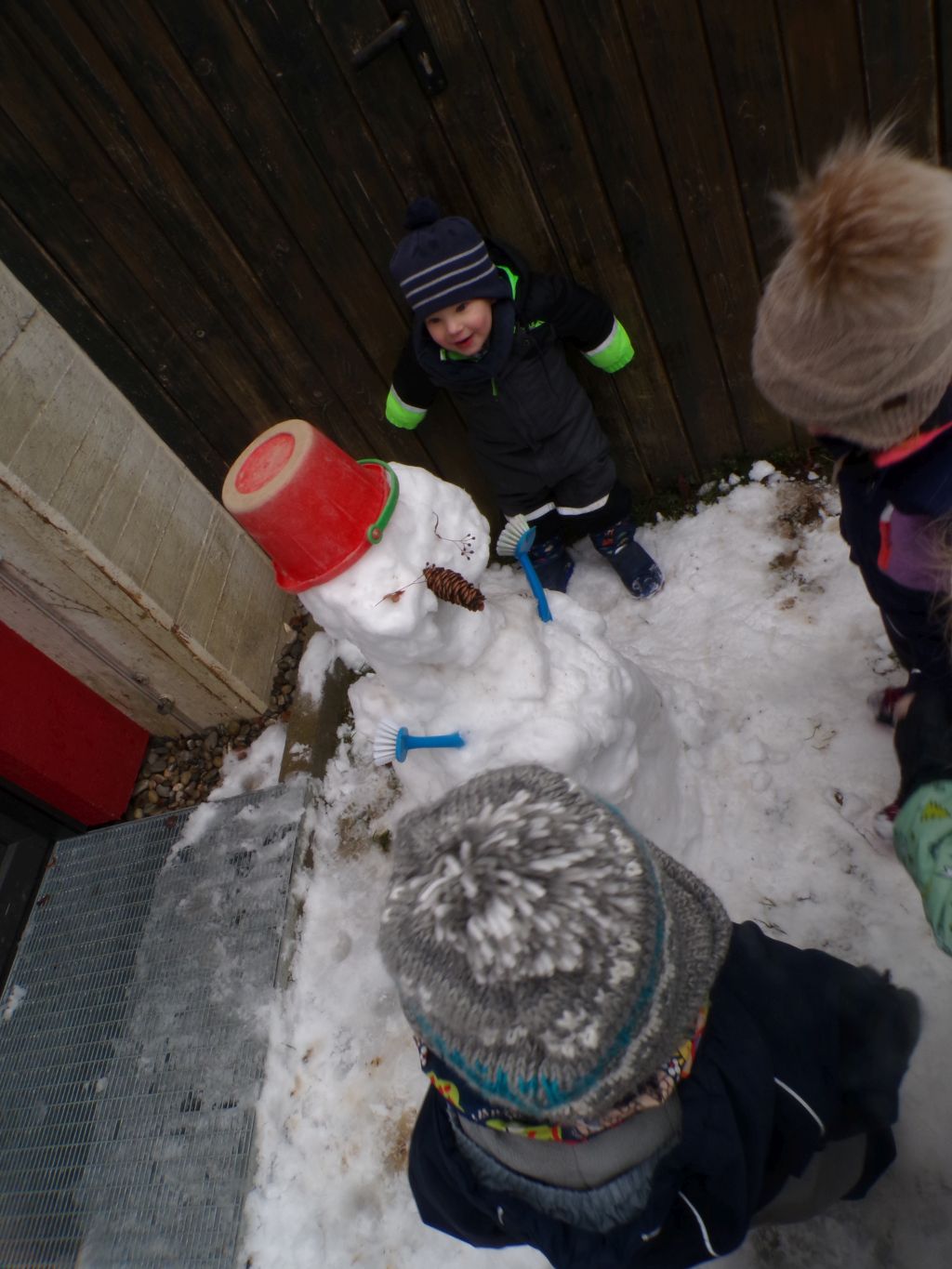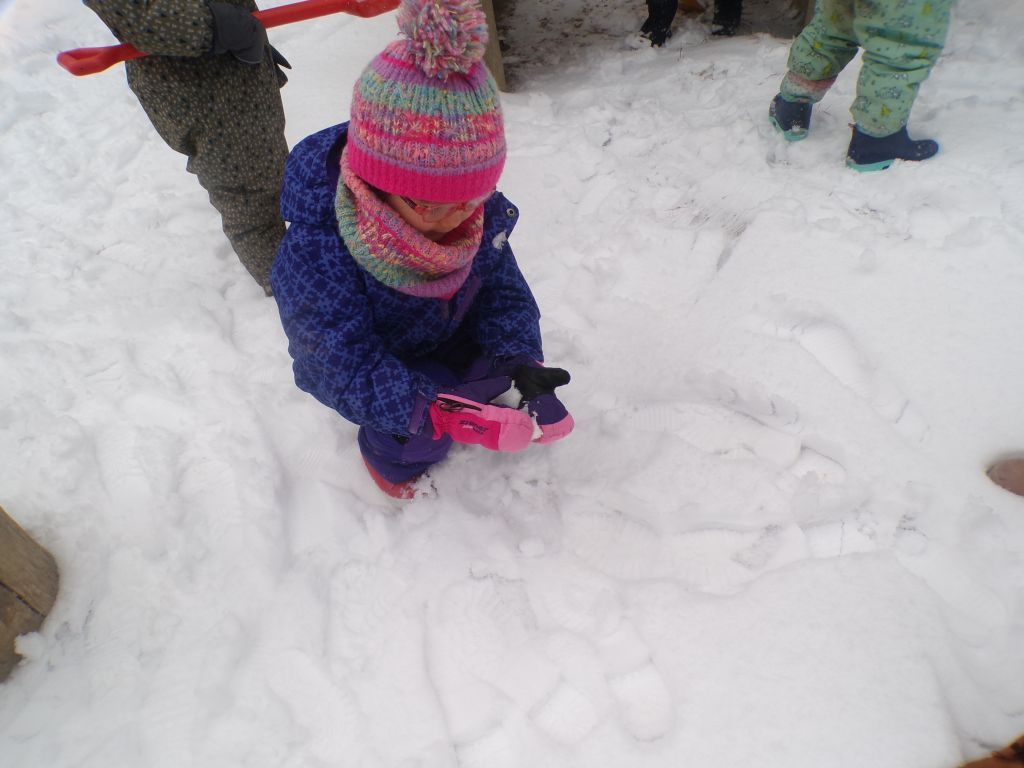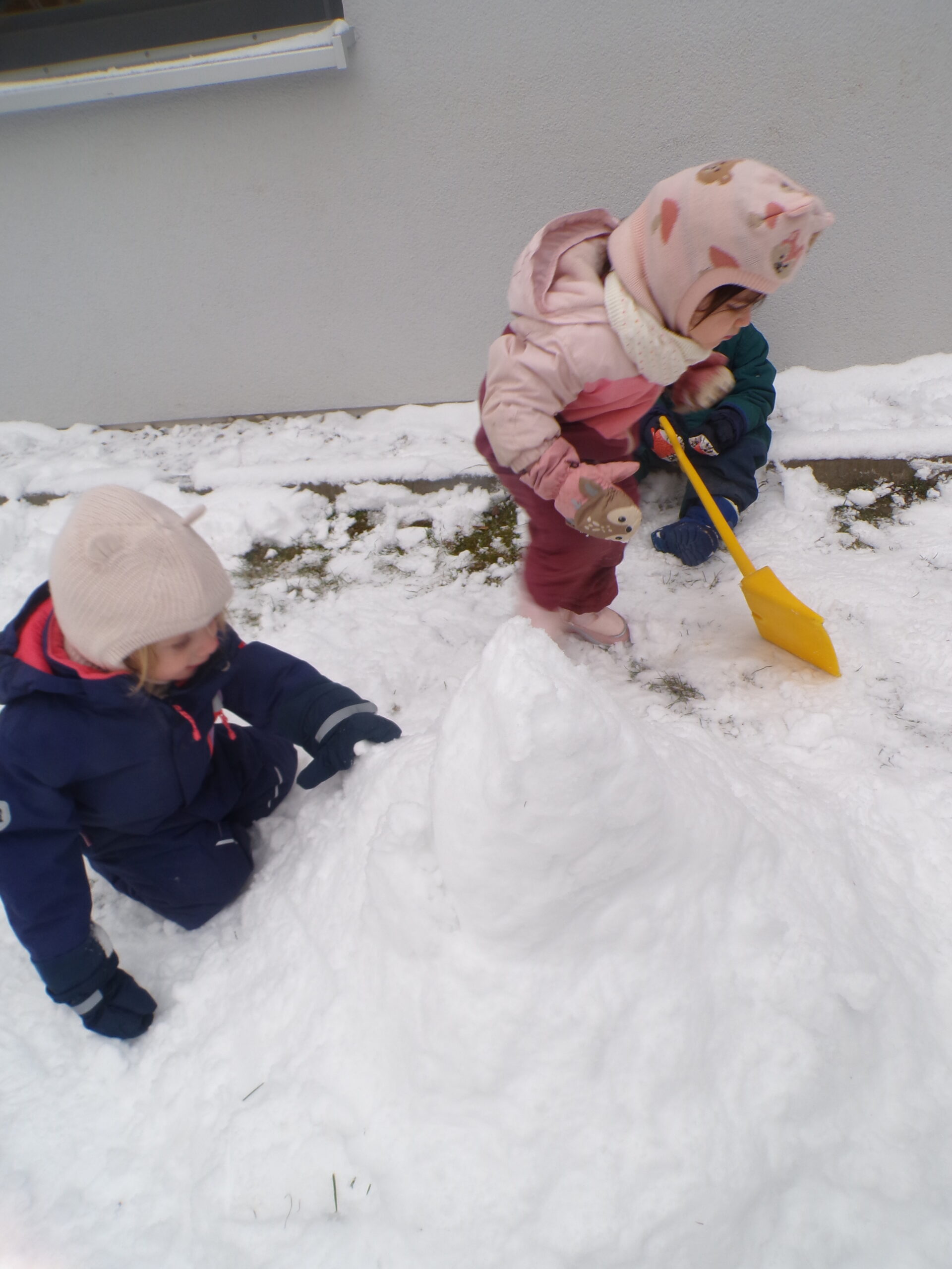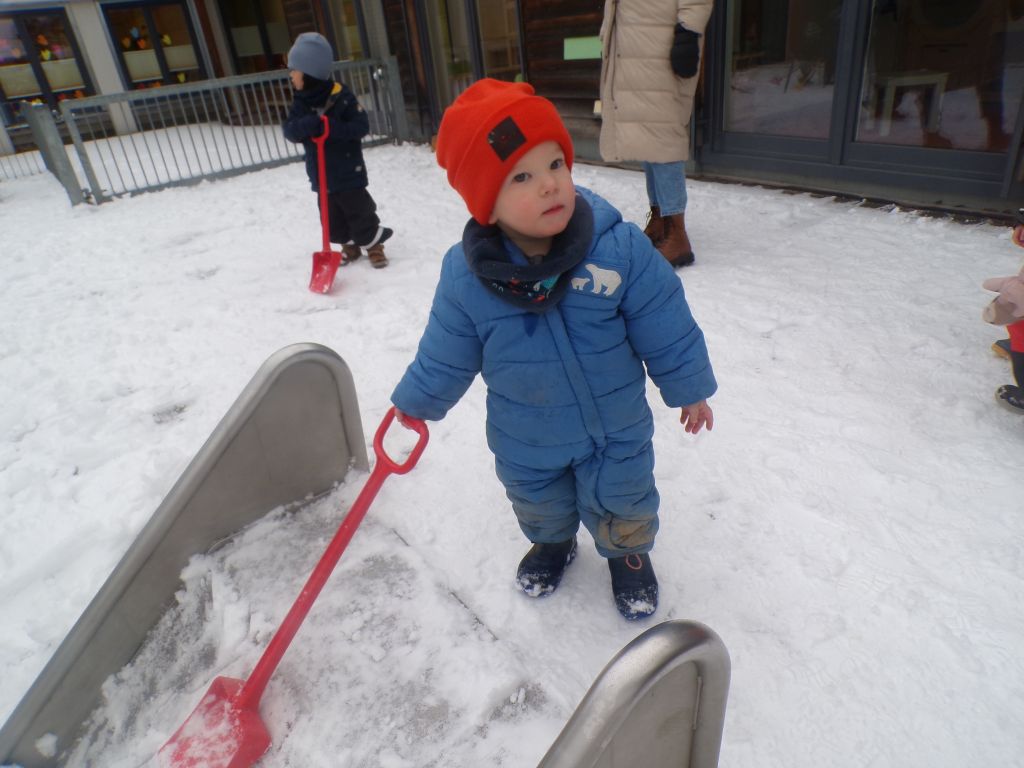 Einige Kinder hatten großen Spaß daran, den verschneiten Weg freizuschaufeln. Mit viel Ausdauer und Kraft halfen sie den Erwachsenen mit einer großen Schaufel beim Schneeschaufeln. Andere Kinder rollten den kleinen Berg hinunter, legten sich in den Schnee oder probierten sogar vorsichtig, wie er schmeckt. Mit allen Sinnen erkundeten sie den Schnee!